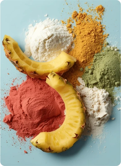 Our portfolio offers natural, sustainable ingredients such as fruit flours, extracts, and enzymes, designed to deliver both functional and nutritional value. With versatile applications across dairy, bakery, plant-based, and meat products, these solutions are available at different development stages, from pilot to market-ready.